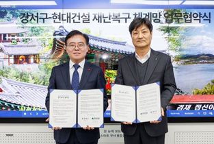 [ 한국미디어뉴스 이원영 기자 ] 서울 강서구는 15일 폭설, 수해와 같은 자연재해에 보다 신속히 대응하기 위해 현대건설(대표이사 이한우)과 손을 맞잡았다. 구는 이날 구청에서 현대건설과 ‘민간위험시설물 긴급 복구 지원’을 위한 업무협약을 체결했다. 협약식에는 진교훈 구청장을 비롯해 김태희 현대건설 건축사업부장 등이 참석했다. 협약에 따라 양측은 자연재해 복구 활동에 적극 협력하기로 했다. 주요 내용은 피해 복구 작업에 필요한 굴삭기, 덤프, 지게차 등 장비 긴급 투입, 신속한 복구를 위한 대민지원 등이다. 진교훈 구청장은 “이번 협약으로 예기치 못한 자연재해가 발생했을 때 신속한 복구가 이뤄질 것으로 기대한다”며 “자연재해 대응 안전망을 더욱 공고히 구축해 나가겠다”고 말했다. 한편, 업무협약식과 함께 이웃돕기 성금 전달식도 진행됐다. 현대건설과 인창개발(회장 김영철)은 어려움에 처한 지역 주민을 위해 써달라며 성금 3천만 원을 기탁했다.