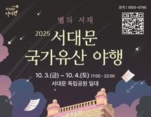 [ 한국미디어뉴스 이보영 기자 ] 서대문구가 다음 달 3∼4일 오후 5시부터 밤 10시까지 서대문독립공원 일대에서 ‘별의 서재’란 주제로 ‘2025 서대문 국가유산 야행’을 개최한다. 야경(夜景), 야사(夜史), 야로(夜路), 야설(夜說), 야시(夜市), 야화(夜畵), 야숙(夜宿), 야식(夜食) 등의 8야(夜) 프로그램을 통해 역사와 문학이 어우러지는진 특별한 밤을 선사한다. '야경(夜景)-별 하나에 국가유산'은 문화유산·문화시설 야간 개장 프로그램으로 서대문형무소역사관과 국립대한민국임시정부기념관이 참여한다. 두 시설 모두 행사 양일간 오후 10시까지 연장 운영하며 예약 없이 누구나 참여할 수 있다. '야사(夜史)-별을 찾는 시간'은 서대문 역사문화해설사와 함께하는 ‘야간 가이드 투어’로 독립과 자주를 주제로 독립문 일대에서 진행되며 참여자 전원에게 영천시장 상품권(5천 원 상당)을 제공한다. '야로(夜路)-별을 찾는 시간'은 재미와 교육 효과를 동시에 주는 스탬프 투어로 독립신문 완성 미션을 달성한 방문객에게 서대문 야행 기념품을 증정한다. 이머시브(Immersive, 관객 몰입형) 연극 ‘서대