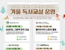[ 한국미디어뉴스 이원영 기자 ] 서울 도봉구 도봉문화재단 소속 구립도서관 5개관이 ‘2026년 겨울 독서교실’을 운영한다. ‘독서교실’은 매년 여름·겨울방학 기간 지역 어린이들에게 독서문화 체험 기회를 제공하기 위해 운영되는 프로그램이다. 원당마을한옥도서관에서는 12월 22~29일 ‘독서 탐험대, 토론 대작전!’을, 도봉문화정보도서관에서는 1월 5~8일 ‘상상ON, 그림책 연극 교실’을, 도봉기적의도서관에서는 1월 7~9일 ‘어린이 역사 법정’ 프로그램을 운영한다. 도봉아이나라도서관은 1월 19~23일 ‘플라이가이 스토리 클럽’을, 쌍문채움도서관은 1월 20~29일 ‘쌍문채움도서관 겨울독서교실’을 운영한다. 도서관별 프로그램 참여 방법 등은 도봉구통합도서관 누리집에서 확인 가능하다. 쌍문채움도서관에서 운영하는 ‘쌍문채움도서관 겨울독서교실’은 별도 모집없이 예하예술학교 학생들과 진행한다.