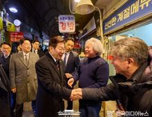 [ 한국미디어뉴스 황영수 기자 ] 이재명 대통령과 김혜경 여사는 오늘 낮, 설 명절을 앞두고 충북 충주시에 위치한 무학시장을 찾아 지역 세밑 물가를 점검하고 상인들을 만나 현장 의견을 청취했다. 무학시장은 지난 1978년 노점상들의 정착을 위해 개설된 전통시장이며, 이번 방문은 설 민심을 청취하기 위한 민생 행보의 일환이다. 이 대통령과 김 여사는 시장 내 여러 상점을 들러 “새해 복 많이 받으세요”라며 인사를 했고, 상인과 시민들은 환호와 박수로 이 대통령 부부를 맞았다. 이 대통령 부부에게 더덕을 판매한 상인은 “덕분에 마수걸이를 한다”며 “오늘 장사가 잘될 것 같다”고 말해 웃음을 자아냈다. 다른 상인들도 “힘나게 해주셔서 감사하다”, “너무 고생 많으시다”며 인사를 전했다. 이 대통령 부부는 황태포, 시금치, 곶감과 깐밤 등 제수용품과 먹거리를 구입했고 백도라지, 마른 멸치, 배추전 등을 즉석에서 맛보기도 했다. 이 대통령 부부는 온누리상품권과 현금으로 결제했다. 김 여사가 물건을 고르는 사이 이 대통령은 상인들에게 “장사는 잘 되느냐”, “곧 설인데 어떠시냐”고 물었다. 정육