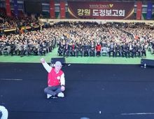 [ 한국미디어뉴스 이원영 기자 ] 강원특별자치도는 3월 15일 오후 1시30분, 원주 치악체육관에서 '도민과 함께하는♥ 강원 도정보고회' 원주권 행사를 개최했다. 이번 보고회는 2026년 도정 운영 방향인 ‘도민공감 행정’을 현장에서 실현하기 위해 마련된 자리로, 지난 춘천권 행사에 이어 두 번째로 열렸다. 이 자리에서는 도정의 주요 정책과 현안을 도민에게 직접 설명하고 현장의 목소리를 듣기 위한 소통의 장으로 진행됐다. 이날 행사에는 원주권역 도민 7천여 명이 참석해 체육관을 가득 메우며 높은 관심을 보였다. 유상범 국회의원과 박정하 국회의원, 김시성 도의회 의장, 원강수 원주시장, 김명기 횡성군수, 최명서 영월군수, 심재국 평창군수, 신경호 도 교육감 등 주요 인사도 함께해 도정 현안과 지역 발전 방향에 힘을 모았다. 김진태 도지사는 보고회에서 PPT를 활용해 도정 주요현안을 직접 설명했다. 먼저, 김 지사는 '강원특별법 3차 개정안' 추진상황을 보고하며 “통합특별시 출범으로 강원도와 강원특별법이 절대 소외되어서는 안된다”고 재차 강조했다. 이어 “강원특별법 3차 개정안이 내일 국회 심사에 오