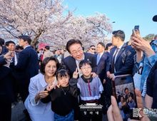 [ 한국미디어뉴스 이원영 기자 ] 여의도 순복음교회에서 부활절 연합 예배를 마친 이재명 대통령과 김혜경 여사는 여의도 윤중로에 나가 벚꽃놀이를 즐기러 온 시민들과 깜짝 소통에 나섰다. 시민들은 “대통령님, 여사님 파이팅”, “반갑습니다”, “감사합니다”, “여기도 봐주세요!”등을 외치며 이 대통령 부부를 반갑게 맞이했다. 이 대통령 부부는 사진 촬영을 요청하는 시민들과 셀카를 찍으며 인사를 나눴고, 파나마와 중국에서 온 외국인들과도 셀카를 찍었다. 이어 자신을 독립유공자의 딸이라고 밝힌 할머니와 그 손녀와도 함께 사진을 찍기도 했다. 이 대통령은 혼자 오신 어르신께 “어디서 오셨느냐?”고 친근하게 말을 건네고, 유모차를 탄 아이나 어린이와 눈높이를 맞추기 위해 무릎을 굽혀 셀카를 찍는 등 특유의 친근함으로 시민들과 눈높이 소통에 나섰다. 어린 아이를 안고 있는 젊은 부부나 신혼부부들의 사진 요청을 유독 반긴 이 대통령은 "신혼부부가 정말 중요하다"고 크게 웃으며 강조했다. 한편, 엄마와 함께 온 한 어린이가 “대통령 할아버지 사진 찍어주세요!” 라고 외치자 대통령실의 한 참모는 “대통