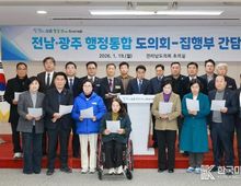 [ 한국미디어뉴스 이종철 기자 ] 전라남도의회는 19일 도의회에서 김영록 전라남도지사와 김대중 전라남도교육감이 참여한 가운데 ‘전남·광주 행정통합 도의회–집행부 간담회’를 열고, 통합 추진 방향과 주요 쟁점에 대해 심도 있는 논의를 진행했다. 이번 간담회는 지난 13일에 이어 두 번째로 마련된 소통의 자리로, 행정통합 추진의 실질성과 현실성을 높이기 위한 다양한 의견 교환이 이뤄졌다. 특히, 통합의 또 다른 핵심 주체인 전라남도교육감이 처음으로 참여해, 행정통합이 교육자치의 권한과 학교 현장 운영에 미칠 영향까지 함께 논의했다는 점에서 의미를 더했다. 이날 도의회는 행정통합에 따라 통합 자치단체의 명칭을 ‘전남광주특별시’로 변경 추진할 것을 제안했다. 도의회는 명칭 문제는 무엇보다 도민의 공감과 사회적 합의가 전제되어야 한다고 강조하고 지역의 역사성과 정체성, 상징성을 함께 담아내야 하는 사안이라는 입장을 밝혔다. 또한, 통합 추진 과정에서 ▲행정 및 의회 통합청사 지정 ▲도의회의 특별법안 마련에 대한 적극적 참여 ▲지역 간 균형발전 보장 ▲교육자치의 위상 정립 ▲도민 참여 절차의 제