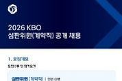 [ 한국미디어뉴스 황영수 기자 ] KBO는 퓨처스리그에서 활동할 KBO 심판위원을 공개 채용한다. 이번 채용은 KBO 야구심판 양성과정 수료자(2026년 야구심판 양성과정 수료 예정자 포함) 또는 대한야구소프트볼협회(KBSA) 및 산하단체, 독립리그 소속 심판으로 1년 이상의 심판 활동 경력(단체장 직인 필수) 보유자에 한해서 지원이 가능하다. 최종 합격자는 2026 KBO 공식 심판위원으로 활동하게 되며, 근무 종료 후 평가 결과에 따라 정규직 전환이 검토된다. 채용과 관련된 세부 정보 및 우대 사항은 채용 공고문을 통해 확인 가능하다. 접수 기간은 오늘(2일)부터 23일(월)까지며, KBO 채용 홈페이지(kbo.saramin.co.kr)에서 지원 가능하다.