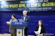 [ 한국미디어뉴스 이종철 기자 ] 전라남도의회 박형대의원(진보당ㆍ장흥1)은 3일 도의회 브리핑룸에서 최근 타결된 ‘10.29 한미 관세협상’에 대한 진보당, 정의당 공동 기자회견에 참석해 공동 입장을 발표했다. 이날 입장문 낭독에는 진보당 오미화ㆍ박형대 의원, 정의당 김미경 의원이 함께했다. 두 당은 입장문을 통해 “이번 한미 관세협상은 미국의 부당하고 폭압적인 요구에 굴종한 굴욕적 합의”라며 “대한민국 정부는 국민 동의 없이 막대한 현금투자를 약속하고 미국의 일방적 요구를 수용했다”고 비판했다. 정부는 지난 10월 29일 아시아태평양경제협력체(APEC) 정상회의를 계기로 미국과의 관세협상 세부 합의를 발표했다. 이번 협상에 따라 한국은 총 3,500억 달러 규모의 대미 금융투자 패키지를 구성해 이 중 2,000억 달러를 현금투자(연간 200억 달러 한도), 1,500억 달러를 조선업 협력으로 추진하기로 했다. 또한 자동차 관세는 기존 25%에서 15%로 인하되며, 반도체·의약품 등 일부 품목은 무관세 혜택을 받게 된다. 전남도의회 진보당·정의당 의원들은 “이 협상은 사실