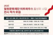 [ 한국미디어뉴스 이원영 기자 ] (재)철원문화재단은 2026년 아트하우스 전시에 참여할 작가를 오는 4월 8일부터 17일까지 공개 모집한다. 이번 공모는 단순히 작품을 전시하는 형식을 넘어, 전시 공간에서의 관람 경험, 체험 프로그램, 도슨트 운영까지 작가와 함께 만들어가는 전시로 운영될 예정이다. 아트하우스는 지역 주민과 방문객이 일상 속에서 자연스럽게 예술을 경험할 수 있도록 조성된 문화예술 공간으로, 2026년에는 공모전시 4회와 기획전시 2회를 운영할 예정이며, 지난해에는 공모전시 3회와 대관전시 3회를 진행하는 등 다양한 전시와 체험 프로그램을 통해 생활 밀착형 예술 향유 기회를 꾸준히 제공해왔다. 이번 공모를 통해 선정된 작가는 전시 기간 동안 작품 설치 및 철수, 공간 구성, 관람 동선 기획, 관람객 대상 체험 프로그램(해당 시), 도슨트 운영 협력, 홍보 협조 등 전시 전반의 운영 과정에 참여하게 된다. 철원문화재단 박현웅 본부장은 “이번 공모는 전시 결과물뿐 아니라 전시가 운영되는 전 과정을 작가와 함께 만들어가는 협력 프로젝트로, 작가의 창작활동을 적극 지원하는 데 중점을 두