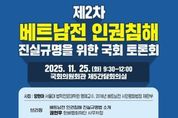 [ 한국미디어뉴스 이원영 기자 ] 민형배 의원(더불어민주당, 광주 광산을)이 마련한 '제2차 베트남전 인권침해 진실규명을 위한 국회 토론회'가 내일(25일) 오전 9시 30분부터 국회의원회관 제5간담회의실에서 개최된다. 이번 토론회는 베트남전 파병군인 인권침해에 대한 진실규명 문제를 논하는 최초의 공개 토론회이다. 지난 9월 30일 민형배 의원은 '베트남전쟁 시기 대한민국 국군에 의한 민간인 및 파병군인 등에 대한 인권침해 사건 진실규명특별법안'(민형배 의원 등 30명 공동발의, 이하 베트남전 진실규명법)을 발의했다. 이 법안은 한국군에 의한 집단학살 등 인권침해 사건뿐만 아니라 파병군인의 자살·전쟁 후유증 등을 조사 범위에 포함하도록 한다. 법안 발의에 이어 개최되는 이번 토론회에서는 베트남전 파병군인이 겪은 군 내부 폭력·자살·전쟁 후유증 등의 인권침해를 중심으로 논의한다. 양현아 서울대 법학전문대학원 명예교수가 사회를 맡고, 하미학살 피해생존자 응우옌티탄이 영상 발언을 통해 베트남전 진실규명법 제정을 국회와 시민사회에 호소한다. 노용석 교수(국립부경대학교)가 “베트남전 파병과 민주주의, 그리고 파병