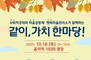 [ 한국미디어뉴스 김서안 기자 ] 가평군은 오는 18일 오전 10시부터 오후 3시까지 음악역 1939 광장에서 주민과 함께하는 축제 ‘2025년 같이, 가치 한마당’을 연다. 이번 행사는 사회적경제기업의 판로 확대와 마을공동체, 경기행복마을관리소의 활동 성과를 알리고 주민 참여를 확대하기 위해 마련됐다. 행사에는 사회적경제기업 5곳, 마을공동체 16곳, 경기행복마을관리소 4곳 등 총 25개 단체가 참여한다. 이날 주민들은 현장에서 직접 사회적경제기업의 제품을 구매할 수 있으며, 공동체별 특색 있는 프로그램을 즐길 수 있다. 주요 프로그램은 △사회적경제기업 생산품 홍보·판매 △공동체와 경기행복마을관리소 활동 전시 및 무료 체험 △합창·뮤지컬 갈라쇼·힐링체조 등 공연 △경품 이벤트 등이 마련돼 있다. 특히 가평마을교육공동체가 제작한 단편영화 상영 등 주민 주도 콘텐츠도 선보일 예정이다. 가평군 관계자는 “‘같이, 가치 한마당’ 축제를 통해 지역사회에서 사회적경제와 공동체 활동이 더욱 확산되기를 기대한다”며 “이번 행사가 지역경제의 활력으로 이어질 수 있도록 주민 여러분의 많은 방문과 성원을 부탁드린다