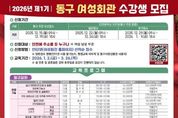 [ 한국미디어뉴스 이원희 기자 ] 인천 동구는 2026년 1월9일까지 ‘2026년 제1기 동구 여성회관 수강생’을 모집한다고 밝혔다. 2026년 1월2일부터 3개월 과정으로 진행되는 제1기 정규강좌 프로그램은 수강생들로부터 자격증 취득과 취업을 이끌어내 호평을 받은 실내인테리어(도배 및 필름) 등의 자격증 취득 프로그램과 어반스케치, 민화 그리기를 포함한 요리·공예 프로그램 등 총 26개 과정으로 운영된다. 특히 2025년 많은 수강생이 커피 바리스타 2급을 취득한 기존 커피 바리스타 강좌에 신규로 야간 강좌까지 추가되어 카페 취업이나 창업에 도움이 될 수 있도록 했다. 또한 한식 디저트 만들기 강좌와 장 담그기, 전통 헤어 강좌는 실생활 활용도가 높은 프로그램으로, 1개월 단기 특강으로 운영해 주민들이 부담 없이 참여할 수 있도록 구성했다. 일일 무료 특강으로는 일일민화그리기 특강과 커피 원데이 클래스가 준비됐다. 수강 신청은 인천 거주자를 대상(동구 주민 우선)으로 여성회관 홈페이지를 통해 선착순 접수하며, 온라인 접수에 불편을 겪는 분이나 동구사랑상품권·평생교육 바우처 사용자는