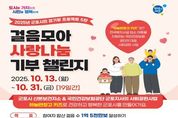 [ 한국미디어뉴스 이보영 기자 ] 군포시 산본보건지소는 오는 10월 13일부터 31일까지(19일간) 국민건강보험공단 군포지사와 함께하는 '걸음모아 사랑나눔' 기부챌린지를 운영한다. ‘걸음모아 사랑나눔’ 기부챌린지는 2023년부터 군포시와 국민건강보험공단 군포지사가 협력해 추진해 온 사회공헌형 걷기 사업이다. 시민들이 일상 속에서 걸음을 모아 목표를 달성하면 이를 기부로 연계해 취약계층에 전달하는 방식으로 진행되며 시민과 지역 내 기업·단체가 함께 참여해 건강한 나눔 문화를 지역사회에 확산시키고 있다. 기부챌린지는 군포시민 누구나 참여할 수 있으며 참여 기간은 10월 13일부터 31일까지이다. 참여방법은 워크온 앱을 설치한 뒤 ‘군포시 공식 커뮤니티’에 가입해 챌린지에 참여하면 된다. 챌린지 기간 동안 누적 목표 걸음 수 1억 5천만보를 달성하면 국민건강보험공단 군포지사에서 기부하는 총 100만 원의 기부금이 관내 아동복지시설과 지역아동센터 2곳에 전달될 예정이다. 김미경 군포시 보건소장은 “이번 챌린지는 단순히 건강을 위한 걷기를 넘어 시민 한 분 한 분의 발걸음이 모여 취약계층을 돕는 소중한 나눔으로 이어진