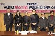 [ 한국미디어뉴스 이보영 기자 ] 군포시는 17일 시청 3층 중회의실에서 ‘2025년 군포시 우수기업 인증서 및 현판 수여식’을 열고 5개 우수기업에 인증서와 현판을 수여했다. ‘우수기업 선정사업’은 2022년부터 시작하여 올해 4번째로 추진하는 사업으로 일자리 창출, 세수 증대 등 지역경제 활성화에 기여한 기업을 선정하여 인센티브를 부여하는 사업이다. 선정된 우수기업은 인증기간(3년) 동안 군포시 중소기업 육성자금 지원 시 추가 이차보전, 군포시 관내 공영주차장 이용 시 주차요금 감면, 협약병원 의료비 지원 등의 인센티브가 부여된다. 하은호 군포시장은 “어려운 경제 상황 속 관내 우수한 기업에 활력을 불어넣기 위한 우수기업 선정사업에 관심 가져주심에 감사드리며, 앞으로도 기업지원 사업을 다각화하여 기업 경영하기 좋은 환경을 만들겠다”고 말했다. 올해 선정된 군포시 우수기업은 △(주)아이씨에이치 △㈜지비티코리아 △주식회사예선테크 △듀라텍 주식회사 △㈜트리플닷 으로 총 5개 기업이다.