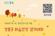 [ 한국미디어뉴스 이보영 기자 ] 서울 강북구는 오는 28일 오후 2시부터 4시까지 정신건강의 날 기념 마음건강 걷기대회를 개최한다. 이번 행사는 ‘10월 10일 정신건강의 날’을 기념하여 주민들이 걷기 활동을 통해 일상 속 마음건강을 돌보고, 정신건강의 중요성에 대한 사회적 인식을 높이기 위해 마련됐다. 걷기 코스는 강북구보건소 맞은편 버스정류장에서 출발해 벌리교까지 이어지는 우이천변 1.5km 구간으로, 가을 정취를 느끼며 여유롭게 걷기 활동을 즐길 수 있다. 체험을 통해 정신건강의 중요성을 느낄 수 있도록 풍성한 프로그램도 준비됐다. 주요 프로그램으로는 △마음건강 스탬프 챌린지 △정신건강복지센터 회원들의 작품 전시 △마음건강 포토부스 및 홍보부스 등이 있으며, 행사 참여자와 완주자에게는 소정의 기념품이 제공될 예정이다. 마음건강에 관심 있는 지역주민이면 누구나 걷기대회에 참여할 수 있으며, 모집 인원은 선착순 300명이다. 참가 신청은 24일 오후 6시까지 강북구청 홈페이지 또는 강북구정신건강복지센터를 통해 가능하다. 이순희 강북구청장은 “마음을 돌보는 작은 걸음이 개인의 행복뿐