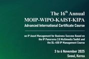 [ 한국미디어뉴스 이원영 기자 ] 지식재산처는 세계지식재산기구(WIPO) 및 한국발명진흥회(KIPA)와 공동으로 11월 3일~ 6일까지 한국지식재산센터(서울 강남구)에서 '국제 지식재산 전문가 인증과정(AICC)'을 개최한다. 올해는 지식재산처·WIPO·KIPA가 공동 개발한 지식재산(IP) 비즈니스 교육 e러닝 콘텐츠인 IP 파노라마 2.0을 활용해 온라인 과정을 수료한 119개국 1,364명 중 23개국 35명의 우수 학습자를 최종 선발해 서울에서 오프라인으로 심화 교육을 진행한다. 이번 교육을 통하여 세계 각국의 지식재산 전문가들이 지식재산 경영 및 활용 전략을 수립하는데 도움을 받을 수 있을 것으로 기대된다. 이번 오프라인 교육 과정은 국제 비즈니스 경영 측면에서 지식재산의 효과적인 활용과 관련된 ▲ 지식재산(IP) 가치 평가 및 금융 ▲ 인공지능(AI) 등 최신 IP 동향 ▲ 특허등급 평가 및 활용 사례 ▲ IP 면허 전략 ▲ IP 면허 협상을 위한 실습 등으로 구성됐다. 특히, 창업초기기업ㆍ개척기업을 위한 IP 경영전략 수립 방법, 분쟁 대응전략 등의 내용도 포함되어 있어 경영 실무역량 배양에 도움이 될 것으