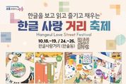 [ 한국미디어뉴스 이보영 기자 ] 세종시문화관광재단은 오는 10월 18일부터 26일까지 한솔동 한글사랑거리(첫마을 정류장 인근) 일원에서 ‘한글 사랑거리 축제’를 개최한다. 이번 축제는 한글문화도시 세종의 상징공간인 ‘한글 사랑거리’를 중심으로 시민이 한글을 보고, 읽고, 즐기며 한글문화의 가치를 체험하는 문화축제로 마련됐다. 특히 한국영상대학교, 한솔동 상인회 등 지역기관이 함께 참여해 한글문화를 지역상권과 연결하고 세종만의 한글문화 네트워크를 확장할 전망이다. 행사는 10월 18~19일과 24~26일, 총 5일간 진행되며, ‘읽고·보고·즐기고·채우는’ 네 가지 주제를 중심으로 전시·공연·체험·먹거리가 어우러진 다채로운 프로그램으로 시민들을 맞이한다. 먼저 한글을 ‘읽고’ 즐길 수 있는 테마에서는, 한글 이야기 공모전 선정작 5편과 삽화·캐릭터 디지털 감상, 거리에서 펼쳐지는 자율 독서로 한글의 즐거움을 느껴볼 수 있다. 거리 곳곳에서는 시민들이 ‘보고’ 즐길 수 있는 다양한 공연이 이어진다. 18일에는 한글 컬러마임 퍼포먼스(13시), 세종거리예술가 공연(17시)이 펼쳐지고 19일·25일·26