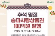 [ 한국미디어뉴스 이보영 기자 ] 민족 대명절 추석을 앞두고, 서울 송파구가 총 100억 원 규모의 ‘송파사랑상품권’을 발행한다고 14일 밝혔다. 추석맞이 ‘송파사랑상품권’은 오는 17일 오후 4시 서울페이플러스 앱을 통해 판매를 시작한다. 총발행액은 지난 설과 같은 1백억 원 규모다. 이번 추석은 하루 연차를 쓰면 최대 열흘까지 쉴 수 있는 황금연휴다. 구 관계자는 “길어진 연휴만큼 늘어난 장바구니 부담을 덜고, 지역경제에 활력을 불어넣고자 상품권 발행을 결정했다”라고 설명했다. ‘송파사랑상품권’은 발행 시마다 반응이 뜨겁다. 고물가 시기 명절 준비 비용 등을 조금이나마 아낄 수 있기 때문이다. 특히, 이번 상품권 할인율은 7%로 지난 설 5% 대비 더 합리적인 가격이다. 만약 상품권 50만 원어치를 사려면 46만 5천 원만 내면 되는 셈이다. 앞서, 연초 설 상품권이 발행 조기 매진된 만큼 이번에도 빠른 소진이 예상되므로 구매를 서두르는 편이 유리하다. 1인당 구매 한도는 50만 원이며 상품권 유효기간은 구입일로부터 5년이다. 상품권은 관내 서울페이 가맹점에서 모바일 간편결제로 현