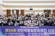 [ 한국미디어뉴스 이원영 기자 ] 용인특례시는 10일 시청 컨벤션홀에서 민족통일 용인특례시협의회 주관으로 ‘민족통일 용인특례시대회와 제56회 한민족통일문화제전 시상식’이 열렸다고 밝혔다. 이날 행사는 한반도의 평화와 통일을 주제로 한 글짓기·웹툰·포스터·사진 공모전의 입상작을 시상하고, 유공회원에게 표창을 수여하고자 마련됐다. 민족통일 용인특례시협의회는 1981년 창립한 단체로 매년 태극기 나눔을 비롯해 지역사회 통일운동 의식 제고 등을 위한 다양한 활동을 벌이고 있다. 이날 협의회는 홍보자료 시청, 통일 관련 동영상과 남북 언어 차이에 대한 학습자료를 시청하고 간단한 통일 퀴즈대회를 거쳐 우수 작품 3개를 낭독했다. 이어진 시상식에서는 용인특례시장상 3명 등 총 36명이 수상의 영예를 안았다. 유한종 민족통일 용인특례시협의회장은 “민족의 염원인 한반도 평화통일을 위해 어려운 여건 속에서도 적극 지원해 주시는 이상일 시장님께 감사드린다”며 “대한민국 통일의 그 날이 올 때까지 협의회 회원의 뜻을 한데 모아 더욱 적극 활동하겠다”고 했다. 이상일 시장은 “대한민국이 한국전쟁
