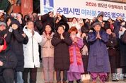 [ 한국미디어뉴스 이보영 기자 ] 이재준 수원특례시장은 1일 아침 팔달산 서장대에서 시민들과 함께 해맞이를 하고, “시민 여러분께서 소망하시는 모든 것을 성취하시길 기원하겠다”고 말했다. 이재준 시장은 “올해도 시민 여러분과 함께 수원을 더 새롭고, 더 빛나게 만들기 위해 노력하겠다”며 “모든 시민이 수많은 역사와 희망을 만드는 멋진 한 해가 되길 바란다”고 기원했다. 서장대 일원을 가득 메운 시민들은 떠오르는 해를 보며 함께 소원을 빌었다. 수원시는 12월 31일 저녁부터 1월 1일 아침까지 일원에서 시민들과 함께하는 송년·신년 행사를 열었다. 12월 31일 밤 10시 30분부터 행궁광장 특설무대에서 ‘제야음악회’가 열렸다. 자정에는 여민각에서 제야 타종 행사를 열고 2026년 병오년(丙午年)의 시작을 알렸다. 이재준 시장, 이재식 수원특례시의회 의장, 김영진(수원시병)·김준혁(수원시정) 의원, 시민 대표 등이 타종했다. 이재준 수원시장과 김현수 제1부시장, 4개 구청장, 실·국장 등은 1일 오전 9시 현충탑을 참배했다.