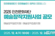 [ 한국미디어뉴스 이원영 기자 ] 인천문화재단은 오는 12월 2026 예술창작지원사업 공모를 시작한다. 공모 분야는 예술창작일반지원, 예술창작집중지원으로 두 가지이다. 접수기간은 2025년 12월 4일부터 12월 26일까지이며, 국가문화예술지원시스템으로 온라인 신청을 받는다. 2026 예술창작지원사업 공모 계획은 분야별, 지역별 예술인 간담회에서 수렴한 현장 의견을 반영하여 마련됐다. 이번 공모의 주요 변경사항 중 하나는 지원자 책임 신청제 확대 시행이다. 2025년부터 추진하고 있는 행정 간소화 기조에 따라 2026년 공모사업은 신청 자격 증빙자료를 최종 선정 이후 제출하는 것으로 변경했다. 이에 예술인의 공모 신청 서류 준비에 대한 부담이 경감될 것으로 예상된다. 2026 예술창작지원사업 공모에 대한 자세한 사항은 인천문화재단 홈페이지 공지사항과 11월 26일 예정된 사업설명회(온라인: 오전 10시 30분, 오프라인: 15시)에서 확인할 수 있다.