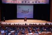 [ 한국미디어뉴스 김풍옥 기자 ] 청주시는 2일 청주예술의전당 대공연장에서 2026년 시무식을 개최하고 새해 시정 운영의 힘찬 출발을 알렸다. 이날 시무식에는 이범석 청주시장, 신병대 부시장을 비롯한 시 직원들과 산하기관 관계자 등 1천200여명이 참석해 새해 각오를 다졌다. 행사 전에는 직원 간 담소 시간이 마련됐으며, 오전 9시부터 국민의례를 시작으로 시장 신년사, 시립예술단 공연, 신년 인사가 순서대로 진행됐다. 이범석 시장은 신년사에서 “민선8기 청주시가 지금까지 시민과 이룬 성장과 변화는 뿌리 깊은 나무가 되어 어떤 비바람에도 흔들리지 않는 밑거름이 됐다”면서 “그 기반을 바탕으로 2026년을 청주의 더 큰 미래와 번영을 향해 나아가는 ‘개화공영(開花共榮)’의 해를 만들겠다”고 밝혔다. 이어진 시립예술단 공연에서 합창단은 ‘우리가 청주다’ 곡을 선보이며 새해를 여는 희망의 메시지를 전했고, 시장과 간부 공무원들은 사무실로 향하는 전 직원과 신년 인사를 나누며 2026년 시정 목표 달성을 위한 의지를 다졌다. 한편, 청주시는 2026년 화두로 개화공영을 선정했다.