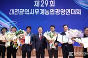 [ 한국미디어뉴스 이보영 기자 ] 이장우 대전시장이 19일 대전시 농업기술센터에서 열린 제29회 한국후계농업경영인 대전시대회 개회식에서 대전 농업 발전에 기여한 공로로 한국후계농업경영인 대전시연합회로부터 감사패를 받았다. 이번 행사는 ㈔한국후계농업경영인 대전시연합회 주최로 열렸으며, 대전지역 농업인과 농협 관계자, 도시민 등 300여 명이 참석해 농업의 미래를 함께 논의하는 자리가 됐다. 이장우 대전시장은 수상 소감에서 “농업은 국가의 근간 산업으로 식량 안보와 생태계 보전에 중요한 역할을 하고 있다”라며 “과학수도 대전에 걸맞은 첨단기술을 활용해 스마트농업 기반을 조성하고 미래 농업의 성장 동력을 확보하는 데 최선을 다하겠다”라고 말했다.