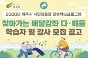[ 한국미디어뉴스 이원영 기자 ] 여주시는 시민 누구나 원하는 시간과 장소에서 배움을 이어갈 수 있도록 지원하는 2026년 시민 맞춤형 평생학습 프로그램 ‘찾아가는 배달강좌’의 학습자와 강사를 모집한다고 밝혔다. ‘찾아가는 배달강좌’는 여주시민 또는 관내 사업체 근로자 7명 이상이 학습모임을 구성해 강좌를 신청하면, 전문 강사가 직접 찾아가 강의를 진행하는 학습자 중심의 평생학습 프로그램으로 이 사업은 평생학습 접근성을 높이고, 학습 사각지대 해소와 공동체 기반 학습문화 확산에 기여하고 있다. 학습자 ‘다·배움’모집은 2026년 2월과 5월(각 1~10일) 진행되며, 선정된 학습모임은 강좌당 최대 20시간 이내에서 무료로 교육을 받을 수 있으며, 강사 ‘다·선생’모집은 1월과 4월(각 20~25일) 두 차례 진행되며, 선정된 강사는 학습모임과 매칭돼 강의를 진행한다. 특히, 2026년부터는 기존 일반강좌 외에도 정책 연계형 특화강좌가 새롭게 운영되어 ▲경력단절 여성의 사회 재도약 ▲생활밀착형 생성형 AI 활용 교육 ▲농업·생태·전통문화 융합형 미래인재 양성 등 시민의 생애주기와 지역 특성을 반영한 맞춤형 학습