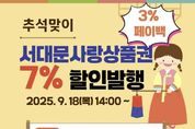 [ 한국미디어뉴스 이보영 기자 ] 서대문구가 추석 명절을 앞두고 지역사회 내 소비 촉진을 통한 소상공인 매출 증대와 민생경제 활성화를 위해 이달 18일 오후 2시부터 모바일 서대문사랑상품권을 발행한다. 발행 규모는 20억 원으로 구는 높아진 상품권 구매 수요에 부응하기 위해 당초 15억 원에서 5억 원을 증액했다. 앞서 올해 2월과 4월 상품권 발행 때에는 단시간에 매진을 기록한 바 있다. 기존 5%였던 할인율이 이번에는 7%로 높아졌다. 여기에다 사용 금액에 대한 3% 페이백(보상 환급)까지 이뤄지면 최대 10%의 할인을 받는 셈이다. 서대문사랑상품권은 서울페이플러스(서울Pay+) 앱을 통해 온라인으로 1인당 월 50만 원까지 액면가 대비 7% 할인된 가격(500,000원 상품권 구입 시 465,000원 지불)으로 누구나 구입할 수 있다. 참고로 보유 한도는 최대 150만 원이다. 이 상품권은 서대문구 내 서대문사랑상품권 가맹점(서울페이플러스 앱에서 검색)에서 사용 가능하다. 단, 유흥 및 사치 업종, 대규모 점포, 대기업·중견기업 프랜차이즈 직영점, 연매출액 30억 원 초과 입시학원 등은 제외