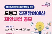 [ 한국미디어뉴스 이원영 기자 ] 서울 도봉구가 2027년 예산편성을 위한 주민참여예산 제안사업을 공모한다. ‘주민참여예산제도’는 주민이 사업을 직접 제안·심사하고 예산편성 과정에 참여함으로써 구 예산의 투명성과 민주성을 높이는 제도다. 공모 분야는 주민의 복리 증진 및 주민 생활에 밀접한 사업 중 주민이 필요하다고 생각하는 사업이다. 사업별 제안 규모는 5천만 원 이하이며, 공연‧축제 등 행사성 사업이나 특정인, 특정 단체를 지원하는 사업 등은 제외된다. 도봉구민이면 누구나 신청할 수 있으며, 신청은 4월 24일까지 도봉구 주민참여예산 누리집으로 하면 된다. 신청서를 작성해 도봉구청 기획예산과 또는 동 주민센터로 방문 제출해도 된다. 접수된 제안은 사업부서의 타당성 검토를 거친 후, 주민참여예산위원회 심사, 주민 모바일 투표를 거쳐 2027년 주민참여예산사업으로 최종 선정된다. 선정된 사업은 하반기 예산편성 과정 이후 내년도에 소관부서에서 사업을 추진한다. 현재 구는 지난해 공모 절차를 통해 선정한 30개 사업을 추진 중이다. 선정 사업으로는 ▲보도를 막는 통신주 이전