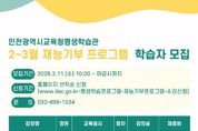 [ 한국미디어뉴스 이원영 기자 ] 인천광역시교육청평생학습관은 오는 23일부터 ‘재능기부 프로그램’을 운영한다. 이번 프로그램은 시민이 강사로 참여해 자신의 전문성과 경험을 공유하는 참여형 평생학습 활동으로, 매월 새로운 주제의 강좌를 통해 생활 속 배움의 기회를 제공한다. 2월부터 운영되는 강좌는 ‘시니어 요가’, ‘시니어 필라테스’, ‘근력 스트레칭’, ‘나를 닮은 꽃그림’, ‘내 마음속의 논어’ 등 총 5가지이다. 수강 신청은 11일 오전 10시부터 평생학습관 누리집에서 선착순으로 진행되며, 자세한 사항은 누리집의 공지사항을 확인하거나 평생교육부로 문의하면 된다.