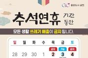 [ 한국미디어뉴스 이보영 기자 ] 금천구는 추석 연휴 기간 생활쓰레기(일반생활쓰레기, 음식물쓰레기, 재활용품) 수거를 일시 중단한다고 밝혔다. 환경미화원들의 휴식권을 보장하고 안전한 근무 환경을 조성하기 위한 조치라고 구는 설명했다. 수도권매립지관리공사와 청소대행업체도 휴무다. 이에 따라 주민들은 10월 3일과 7일, 9~10일 오후 6시부터 자정까지 대형생활폐기물을 제외한 모든 생활쓰레기를 배출할 수 있다. 연휴 기간 중 생활쓰레기 배출이 금지되는 날은 2일과 4~6일, 8일, 11일이다. 구는 쓰레기배출이 일시 중단됨에 따라 주민 불편을 최소화하기 위한 청소상황실과 청소대행업체 기동반을 편성·운영한다. 쓰레기 관련 민원에 신속히 대응할 방침이다. 또한 연휴가 끝나는 10일부터는 인력과 장비를 총동원해 적체된 쓰레기를 일제 수거할 계획이다. 유성훈 금천구청장은 "평소에 묵묵히 금천의 청결을 책임지고 있는 환경미화원 분들께 감사드린다“라며 ”추석 연휴 기간 쓰레기 배출일을 꼭 확인하시어, 서로 배려하고 즐거운 명절을 보낼 수 있도록 주민 여러분의 많은 이해와 적극적인 참여를 부탁드린다
