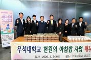 [ 한국미디어뉴스 이종철 기자 ] 완주군이 24일 우석대학교 교양관에서 2026년 ‘천 원의 아침밥’ 사업의 시작을 알리는 행사를 열고 올해 본격적인 사업 추진에 나섰다. 이날 행사에는 유희태 완주군수와 박노준 우석대학교 총장, 이순덕 군의원, 김정은 사회적협동조합 양지뜰 대표 등이 참여해 바쁜 학업으로 아침 식사를 거르는 대학생들에게 로컬푸드 식재료로 만든 식사를 직접 배식하며 따뜻한 격려를 건넸다. 군은 학생들의 높은 호응을 반영해 올해 운영 규모를 작년보다 대폭 키웠다. 지난해 기준 43일이었던 일수를 올해 80일로 2배 가까이 확대해 운영한다. 이를 통해 더 많은 학생이 학기 중 꾸준히 양질의 아침 식사를 제공받을 수 있게 됐다. 제공하는 메뉴 역시 학생들의 목소리를 적극적으로 반영했다. 지역산 쌀을 활용한 다양한 덮밥류와 완주로컬푸드협동조합(이사장 권승환)과 재단법인 완주공공급식지원센터를 통해 공급받은 신선한 제철 과일 등 영양가 높은 간편식 식단으로 구성해 운영할 예정이다. 유희태 완주군수는 “천 원의 아침밥 사업은 청년들이 건강하게 미래를 준비하도