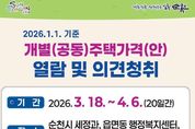[ 한국미디어뉴스 이종철 기자 ] 순천시는 1월 1일 기준 개별(공동)주택 가격 열람 및 의견제출 기간을 3월 18일부터 4월 6일까지 운영한다고 밝혔다. 이번 열람 대상 개별주택은 32,223호, 공동주택은 90,057호로 개별(공동)주택 특성 등을 조사해 산정했으며, 가격의 공정성과 객관성을 높이기 위해 한국부동산원(순천지사)의 산정가격 적정성 여부 등의 검증 절차를 마쳤다. 개별(공동)주택 가격의 열람은 세정과 및 읍면동 행정복지센터를 방문하거나 순천시 누리집 및 부동산공시가격알리미를 통해 확인할 수 있다. 열람가격에 의견이 있는 소유자 및 이해관계자는 의견서를 작성해 세정과 및 읍면동 행정복지센터를 직접 방문 또는 우편 제출하거나 부동산공시가격알리미를 이용해 온라인 제출하면 된다. 제출된 의견은 개별(공동)주택의 특성, 적정가격, 인근 주택과의 가격 균형 등을 종합적으로 검토한 뒤 순천시 부동산가격 공시위원회의 심의를 거쳐 개별 통지하고, 최종 확정된 개별(공동)주택 가격은 4월 30일에 공시할 예정이다. 시 관계자는 “공시된 주택 가격은 지방세와 국세, 건강보험료 등의 기초
