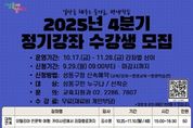 [ 한국미디어뉴스 이보영 기자 ] 서울 성동구가 2025년 4분기 평생학습관 정기강좌 수강생을 오는 9월 29일(월) 오전 9시부터 성동구청 누리집(홈페이지) 신속예약에서 선착순으로 모집한다. 이번 4분기 정기강좌는 대학연계, 디지털, 인문교양, 문화예술, 생활건강 등 구민 삶의 질을 높일 다양한 프로그램으로 구성됐다. 특히, 장애인 인식개선을 주제로 한 특강을 새롭게 마련해 도슨트와 함께 고난을 이겨낸 예술가들을 조명하고, 전문 영화인과 함께 타인의 시선과 감정을 이해하며 공감하는 특별한 시간을 제공한다. 이와 함께 AI와 스마트폰, 주식인사이트, 시사영어, 노르딕워킹 등 실생활에 도움이 되는 실전 강의부터 인문고전, 클래식, 유네스코 세계유산 여행, 글쓰기 등 풍성한 예술·문화 강좌까지 구민들의 다양한 학습 욕구를 충족시킬 예정이다. 성동구 평생학습관은 분기별로 정기강좌를 운영하며, 매번 높은 관심과 참여를 이끌고 있다. 실제로 지난 3분기 정기강좌에는 14개 강좌에 626명의 수강생이 참여해 평생학습에 대한 뜨거운 열기를 확인할 수 있었다. 정원오 성동구청장은 “지적 성장과 자기계발, 공감