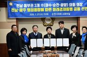 [ 한국미디어뉴스 이종철 기자 ] 여수시의회는 27일 오후 3시 순천시의회 의장실에서 강형구 순천시의회 의장, 최대원 광양시의회 의장과 함께 '전남·광주 행정통합에 따른 전남동부권(여수·순천·광양) 미래경제동맹 공동선언문'을 발표했다. 이번 공동선언은 전라남도와 광주광역시의 행정통합 논의가 진행되는 가운데, 전남동부권이 국가 산업·에너지·물류 거점으로서 수행해 온 역할과 향후 기능이 통합 과정에서 반드시 반영돼야 한다는 데 3개 시의회 의장이 뜻을 모으며 마련됐다. 3개 시의회 의장은 공동선언을 통해 전남·광주 행정통합이 수도권 일극체제 완화와 국가균형발전을 위한 계기가 돼야 하며, 단순한 행정구역 개편을 넘어 산업·교통·에너지·물류·인재 정책을 연계하는 초광역 경제권 형성으로 이어져야 한다는 점을 강조했다. 아울러 행정통합 이후 정책과 재정, 대규모 국책사업이 광주권과 전남 서부권에 집중될 가능성에 대해 우려를 표하며, 전남동부권의 산업적 위상과 기능이 통합 논의 전반에 균형 있게 반영돼야 한다는 입장을 분명히 했다. 여수·순천·광양 3개 시의회 의장은 공동선언을 통해 ▲전남동부권의 국가산업 거