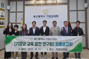 [ 한국미디어뉴스 이원영 기자 ] 기장군의회는 지난 10월 17일 의원연구단체인 ‘기장군 교육 발전 연구회’ 최종 보고회를 주민상담실에서 개최했다고 밝혔다. 이날 최종 보고회에는 해당 연구 모임의 대표인 박우식 의원을 비롯해 박홍복 의원, 박기조 의원, 구혜진 의원과 연구용역 수행업체(부산교육대학교 이동환 교수) 및 담당 공무원 등이 참석해 지난 6월부터 추진한 연구활동의 성과를 공유하고 질의응답을 통해 기장군의 교육에 대한 심도 있는 의견을 교환했다. ‘기장군 교육 발전 연구회’ 최종 보고회에서는 기장군 교육 현안에 대한 분석과 앞으로의 기장군 교육을 위한 세부 전략과 교육 인프라 불균형 해소를 위한 개선 방안(△스마트 통학 안심 셔틀 시스템 구축 △기장 해양·에너지 융합과학고등학교 설립 제안 △기장군 공공학습·진로센터 설립 제안 △기장 스마트팜 도시농업 교육 제안 △ 지자체 주도 온종일 돌봄 체계 구축 등) 및 추진 과제들이 발표됐다. 연구단체 대표 박우식 의원은 “이번 연구에서 발굴한 정책이 앞으로의 기장군 교육에 반영될 수 있도록 협력적 거버넌스 구축 및 안정적·지속 가능한 재원 조달 모델 마련을 위해