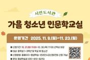 [ 한국미디어뉴스 이원영 기자 ] 부산광역시립시민도서관은 오는 11월 9일부터 23일까지 시민도서관에서 부산 지역 중학생과 학교 밖 청소년 30명을 대상으로 ‘가을 청소년 인문학 교실’을 운영한다. 이번 프로그램은 청소년들이 철학과 문학을 통해 스스로의 삶을 돌아보고, 깊이 있는 사고력과 자기 성찰의 힘을 기르도록 돕기 위해 마련됐다. 프로그램은 일상의 고민에서 철학적 질문을 찾고 생각을 확장해보는 ▲고민이 철학이 되는 시간과 헤르만 헤세의 ‘수레바퀴 아래서’를 읽고 함께 토론하며 사고해보는 ▲세계문학, 청소년을 만나다 총 2개 과정으로 구성했다. 참가 희망자는 10월 21일 오전 11시부터 30일 오후 5시까지 시민도서고나 홈페이지를 통해 선착순으로 신청하면 된다. 자세한 문의는 도서관 평생학습과로 문의하면 된다. 이은경 시민도서관장은 “이번 프로그램이 철학과 문학을 매개로 청소년들이 삶을 성찰하고 사고의 폭을 넓히는 기회가 되길 기대한다”고 전했