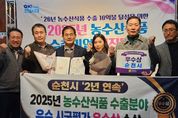 [ 한국미디어뉴스 이종철 기자 ] 순천시는 지난달 28일 남악스카이컨벤션센터에서 열린 2025년 농수산식품 수출분야 우수 시군 평가에서 작년에 이어 우수상을 2년 연속 수상했다. ‘농수산식품 수출 우수 시군’은 전라남도에서 도 내 22개 시군을 대상으로 2024년 10월 1일부터 2025년 9월 30일까지의 수출 실적을 평가해 전문가 심사를 거쳐 선정됐다. 순천시는 지난해에 이어 올해도 수출 220억 원을 목표로 배, 쌀, 참다래, 단감 등 신선 농산물과 매실 가공식품을 포함한 47개 품목의 농특산물을 수출해 왔으며, 올해 10월 기준 230억 원의 수출 실적을 기록하며 목표를 크게 상회하는 성과를 거두고 있다. 특히 해외시장 개척단을 구성해 3개국에서 판촉행사와 수출 바이어 대상 제품 품평회를 여러 차례 개최하는 등 ‘Made in 순천’ 브랜드의 인지도 제고와 신규 바이어 발굴에 적극 나서며 수출 확대에 기여하고 있다. 시 관계자는 “이번 수상은 해외시장에서 순천 농특산물의 품질과 경쟁력을 인정받은 결과”라며, “앞으로도 다양한 수출 촉진 시책과 맞춤형 지원을 통해 농가와 수출기업의 성장을 적