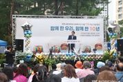 [ 한국미디어뉴스 문상수 기자 ] 고양시원흥종합사회복지관은 지난 18일, 도래울마을1단지 중앙공원에서 개관 10주년 기념행사 ‘함께한 우리, 함께한 10년’을 1,000여 명의 주민이 참여한 가운데 성황리에 마무리했다. 이번 행사는 복지관과 함께 도래울마을1단지 내에서 공동체를 이루어온 원흥도래울마을1단지관리사무소와 고양시립원흥어린이집이 협력해 준비했으며, 복지관과 함께해온 지역주민과 자원봉사자, 후원자들에게 감사의 마음을 전하고, 이웃 간 소통과 화합을 도모하기 위해 마련됐다. 다인예술단의 신나는 고고장구와 고양시립합창단의 식전 공연으로 화려하게 막을 올린 이번 행사에는 이동환 고양특례시장, 김성회 국회의원, 경기도와 고양특례시의회 의원, 유관기관 단체장 등 많은 내빈들이 참석해 축하를 전했다. 이어 진행된 표창 수여식에서는 복지관과 함께한 자원봉사자와 후원자들이 감사패를 받았으며, 비전 선포식과 후원 전달식을 통해 앞으로의 10년을 향한 새로운 다짐을 공유했다. 2부 순서에서는 복지관 프로그램 참여자들이 직접 준비한 ▲줌바댄스 ▲합창 ▲하모니카 공연 등 다채로운 무대가 펼쳐져 관객들의 뜨거운