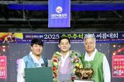 [ 한국미디어뉴스 이보영 기자 ] 울주군청 해뜨미씨름단 소속 노범수 선수가 5일 울산 울주군 울주종합체육센터에서 열린 ‘위더스제약 2025 울주추석장사씨름대회’에서 태백장사에 등극했다. 노범수는 이날 5판 3선승제로 펼쳐진 태백장사(80㎏ 이하) 결정전에서 허선행(수원특례시청)을 꺾고 우승을 차지하며 개인 통산 24번째(태백장사 20회, 금강장사 4회) 황소트로피를 들어올렸다. 시드 배정으로 8강에 오른 노범수는 이은수(영암군민속씨름단)를 만나 들배지기되치기와 왼배지기로 이겼다. 이어 4강에서 만난 문준석(수원특례시청)을 잡채기와 들배지기로 제압하며 무패로 결승에 진출했다. 결승 상대는 개인통산 7번째 태백장사에 도전하는 강력한 우승후보인 허선행(수원특례시청)으로 두 선수의 팽팽한 접전이 예상됐다. 첫 번째 판 허선행이 잡채기를 시도해 노범수가 이를 뒤집기로 반격했으나 그 과정에서 허선행의 목이 꺾이는 부상으로 기권하며, 경기는 노범수의 승리로 마무리됐다. 이로써 노범수는 홈그라운드에서 열린 대회에서 우승을 차지하며, 올 시즌 2번째 장사(25 유성대회, 25 추석대회)에 올랐다. 한