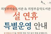 [ 한국미디어뉴스 김서안 기자 ] 의정부시는 2026년 설 명절을 맞아 시민과 귀성객들이 풍성한 연휴를 보낼 수 있도록 미술도서관과 음악도서관을 특별 운영한다. 이번 특별 운영은 연휴 기간 중 설 당일인 2월 17일(화)을 제외한 16일(월)과 18일(수), 이틀간 오전 9시부터 오후 6시까지 진행된다. 두 도서관은 예술과 휴식이 어우러진 공간으로 운영되고 있으며, 연휴 기간 도심에 머무는 시민들이 자유롭게 이용할 수 있도록 개방된다. 시는 이번 특별 개방이 명절 기간 시민은 물론 의정부를 찾은 귀성객 등 방문객에게 지역의 특색 있는 문화공간과 예술 콘텐츠를 알리는 계기가 될 것으로 기대하고 있다. 도서관 관계자는 “설 연휴를 맞아 가족, 친지들과 함께 도서관에서 예술을 향유하며 재충전의 시간을 보내길 바란다”며 “앞으로도 시민들의 일상 속에 문화가 자연스럽게 흐르는 도서관 서비스를 제공하기 위해 노력하겠다”고 말했다.