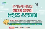 [ 한국미디어뉴스 김서안 기자 ] 남양주시는 10일부터 22일까지 시 전역에서 ‘설맞이 우리동네 새단장 남양주 쓰담데이 집중 추진기간’을 운영한다고 밝혔다. 이번 집중 추진은 설 명절을 앞두고 생활권 주변 환경을 정비하고 시민이 일상 속에서 실천하는 환경정화 활동을 확산하기 위해 마련됐다. ‘남양주 쓰담데이’는 시가 운영하는 대표적인 시민참여형 환경정화 프로그램이다. 특히 이번 쓰담데이는 행정안전부가 추진하는 전국 단위 환경정화 캠페인 ‘우리동네 새단장’과 연계해 추진한다. 지역별·단체별 자율 참여를 통해 공동체 중심의 환경 개선 활동을 확산하는 데 의미를 둔다. 2026년 현재 쓰담데이에는 약 5,200명과 277개 단체가 참여한다. △환경보호단체 △지역사회단체 △우리아파트봉사단 △상인회 등 다양한 주체가 정기적인 활동을 이어가고 있다. 시는 이번 집중 추진기간을 통해 명절 전 도시 환경을 정비하고, 시민 주도의 환경보전 실천 분위기를 확산시킬 방침이다. 이후에도 시민 중심의 자율적인 마을 단위 쓰담데이를 위한 행정적 지원을 지속할 계획이다. 쓰담데이 참여를 희망하는 시민은 남양주시
