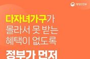 [ 한국미디어뉴스 황영수 기자 ] ■ 다자녀가구가 몰라서 못 받는 혜택이 없도록 정부가 먼저 챙겨드립니다! ▷ 혜택알리미 - 내가 몰라도 찾아서 알려주는 개인 맞춤형 알림 서비스 · 다자녀 국가장학금 · 사회적 배려대상자 도시가스요금 경감 · 전기 요금 복지할인 · 에너지복지요금 지원 · 다자녀가구 자동차취득세 감면 ※ 소득, 거주지 등 개인별 상황에 따라 받을 수 있는 혜택은 달라질 수 있어요. ■ 청년이 몰라서 못 받는 혜택이 없도록 정부가 먼저 챙겨드립니다! ▷ 혜택알리미 - 내가 몰라도 찾아서 알려주는 개인 맞춤형 알림 서비스 · 청년 일경험 지원 · 청년농 창업투자 심층 컨설팅 · 청년주택드림 청약통장 · 청년 월세 한시 특별 지원 · 청년 문화예술패스 지원 ※ 소득, 거주지 등 개인별 상황에 따라 받을 수 있는 혜택은 달라질 수 있어요. ■ 어르신이 몰라서 못 받는 혜택이 없도록 정부가 먼저 챙겨드립니다! ▷ 혜택알리미 - 내가 몰라도 찾아서 알려주는 개인 맞춤형 알림 서비스 · 65세 이상 폐렴구균 국가예방접종사업 · 노인 무릎인공관절 수술 지원 · 노인 일자리 및 사회활