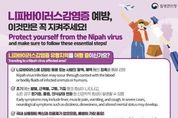 [ 한국미디어뉴스 이원영 기자 ] 예산군은 최근 인도 서벵골주에서 니파바이러스 감염증 확진자가 발생하고 방글라데시에서 사망자가 보고됨에 따라 해외여행을 계획 중인 군민에게 감염병 예방수칙 준수를 당부했다. 지난 1월 30일 질병관리청 발표에 따르면 인도 서벵골주에서 니파바이러스 감염증 확진자 2명이 발생했다. 특히 인접국인 방글라데시에서는 올해 들어 사망자가 발생하는 등 확산세가 이어지고 있어 치명률이 높은 감염병인 만큼 여행객의 각별한 주의가 요구된다. 니파바이러스 감염증은 감염된 동물(과일박쥐, 돼지 등)과의 접촉, 오염된 식품(생대추 야자수액 등) 섭취, 환자 체액과의 밀접 접촉 등을 통해 전파되는 사람과 동물 간 전파 감염병이며, 상온 생존력이 비교적 강해 과일즙에서는 최대 3일, 대추야자 수액에서는 최소 7일간 감염력이 유지되는 것으로 알려져 있다. 주요 증상은 발열과 두통, 근육통 등이며, 중증으로 진행될 경우 현기증과 졸음, 의식 저하 등 신경계 증상을 동반하고 치명률은 40∼75%에 달하지만 현재까지 백신이나 치료제가 없어 사전 예방이 무엇보다 중요하다. 보건소 관계자는