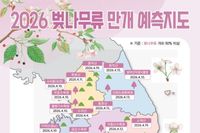전국 평균 만개 시기(개화 50% 기준)는 생강나무가 3월 26일, 진달래 4월 3일, 벚나무류가 4월 7일로 예측됐다.