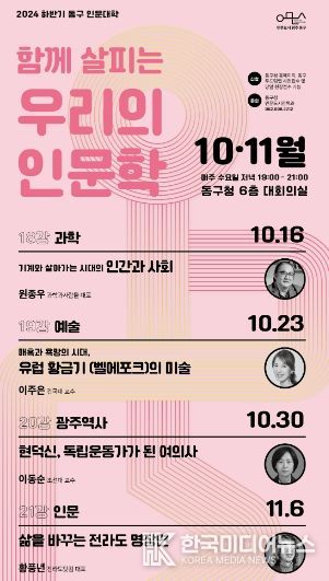 임택 동구청장은 “ 전라도와 지역을 사랑하고 지역문화의 다양성을 위해 쉼 없이 활동해 온 황풍년 강사와 함께 전라도의 명장면을 되새기는 힐링의 시간이 되길 바란다”면서 “시민들과 함께 성장하며 따뜻한 위로를 건넸던 동구인문대학이 내년에도 차질없이 진행될 수 있도록 하겠다”고 말했다.