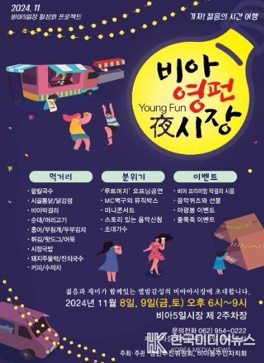 [ 한국미디어뉴스 기자 ] 광주 광산구 비아동 주민들이 비아5일시장에 활력을 불어넣기 위해 8~9일 시장 제2주차장에서 ‘영펀(Young & Fun) 비아야(夜)시장’을 개최한다.
