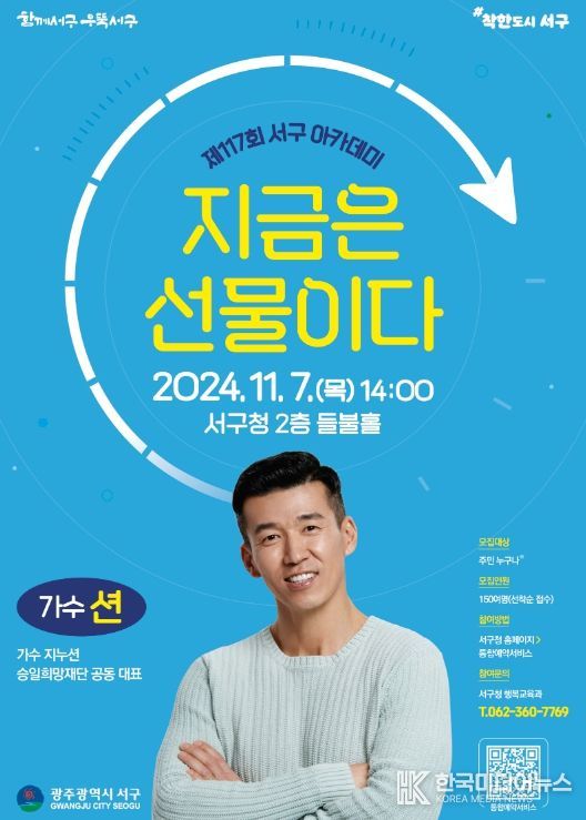 [ 한국미디어뉴스 기자 ] 광주광역시 서구가 7일 오후 2시 서구청 들불홀에서 가수 션을 초청해 ‘지금은 선물이다’를 주제로 제117회 서구 아카데미를 개최한다.