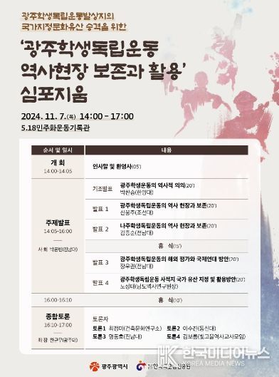 [ 한국미디어뉴스 기자 ] 광주광역시와 (재)한국학호남진흥원은 7일 오후 2시 5·18민주화운동기록관에서 국가지정유산 추진을 위한 ‘광주학생독립운동의 문화유산적 가치 발굴을 위한 심포지엄’을 연다.