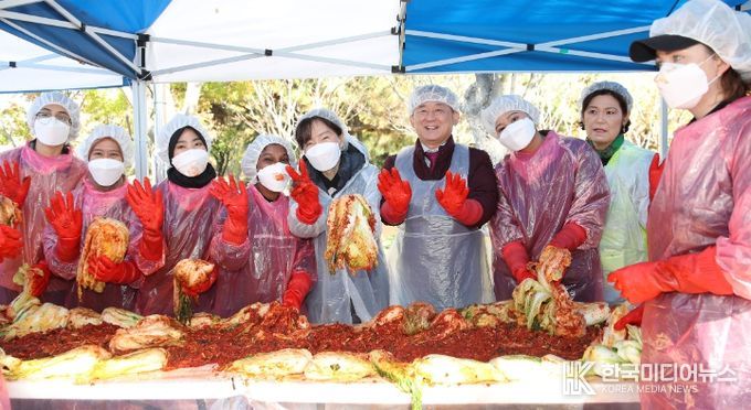 [ 한국미디어뉴스 기자 ] 대전 서구는 6일 둔산동 샘머리중앙공원에서 열린 서구 자원봉사센터 주최의 ‘사랑가득 김장나눔 행사’에 배재대학교 유학생인 정부초청 외국인 장학생 40명이 참여했다고 밝혔다.