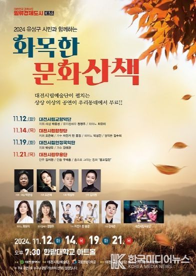 [ 한국미디어뉴스 기자 ] 대전시립예술단은 이달 12일부터 2주간에 걸쳐 화요일과 목요일 오후 7시 30분에 유성구 한밭대학교 아트홀에서 시민을 위한 ‘화목한 문화 산책’공연을 연다.