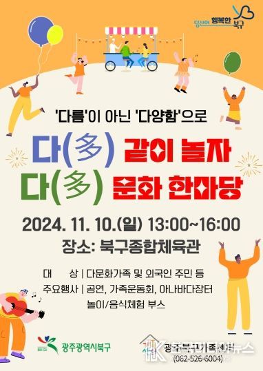 [ 한국미디어뉴스 기자 ] 광주시 북구가 오는 10일 오후 1시 북구종합체육관에서 ‘다 같이 놀자, 다문화 한마당’ 행사를 개최한다고 7일 밝혔다.